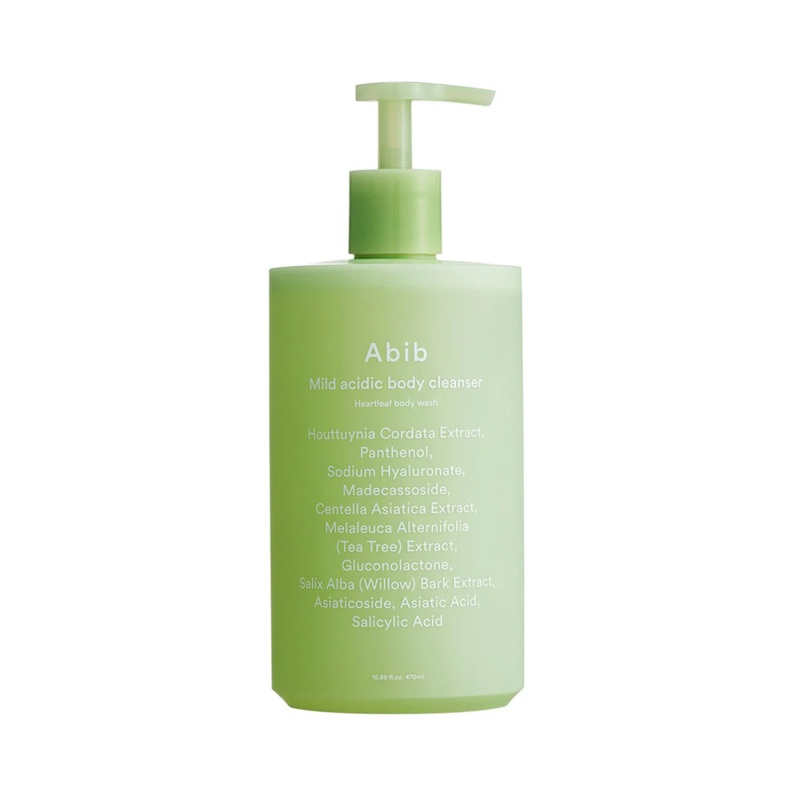 Abib Mild Acidic Body Cleanser Heartleaf Body Wash 470mlDescriptionA functional product that helps improving the acne skin and soothes the irritated skin.Mildly acidic body wash that is safe for calming sensitive skin.A transparent gel-type formula creates