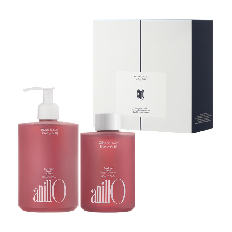 anillO Rosy Night Repair Duo SetDescriptionNourishing Pink Shine with Damask Rose Flower WaterExperience deep hydration with Bulgarian Damask Rose Flower Water, filling your hair and scalp with moisture and nutrients. The rose-tinted formula nourishes whil