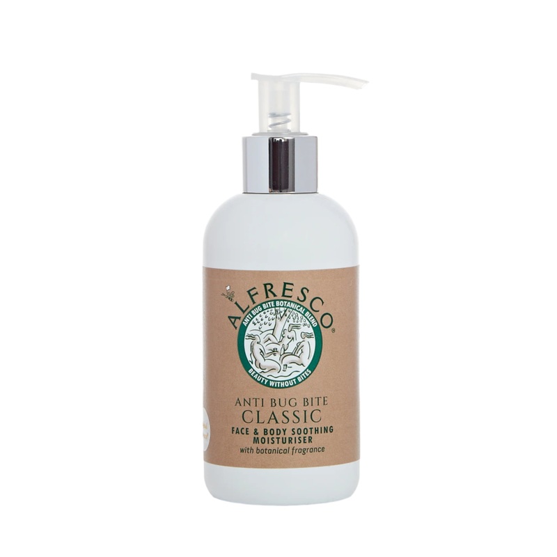 Alfresco Classic Anti Bug Bite Moisturiser is DEET, paraben and paraffin free and as natural as can be. Our safe child-friendly formula contains a secret, signature blend of over 20 essential oils, including sweet and comforting Cinnamon and grounding, earthy Cedarwood and Patchouli. Our beautifully fragranced moisturiser soothes and conditions your face and body, is gentle enough for sensitive skin and unlike any other high-end moisturiser, gives you the bonus of tried, tested and proven protection against bug bites.