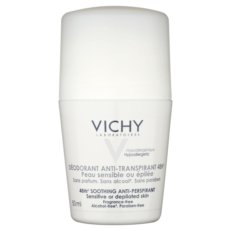 Reinforce skin with the Vichy 48hr Soothing Antiperspirant Roll-On; a breakthrough formula that keeps skin fresh and dry. This lightweight antiperspirant continuously regulates perspiration for 48 hours, offering effective protection without blocking the p