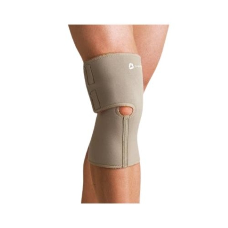 Support is designed with an adjustable wrap to allow for greater comfort of fit, ease of use and compression variation for people with arthritis, swollen and/or fluid on the knee.