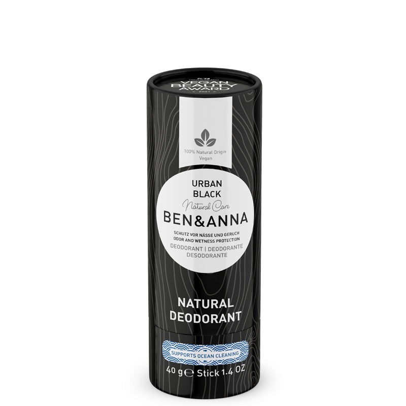 Ben & Anna Natural Deodorant Urban Black uses Shea Butter and Soda to create a solid stick that goes on to the skin smoothly, is never greasy or sticky, and leaves the skin feeling great.With a grounding and yet refreshing scent of sweet Cedarwood, Conifers and fresh Wild herbs, this deodorant is suitable for men and women alike.