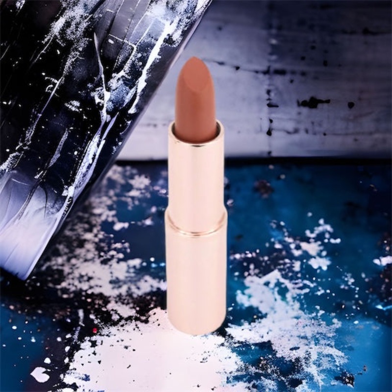 Carefree is a beachy nude shade of lipstick with a matte finish and a creamy texture.