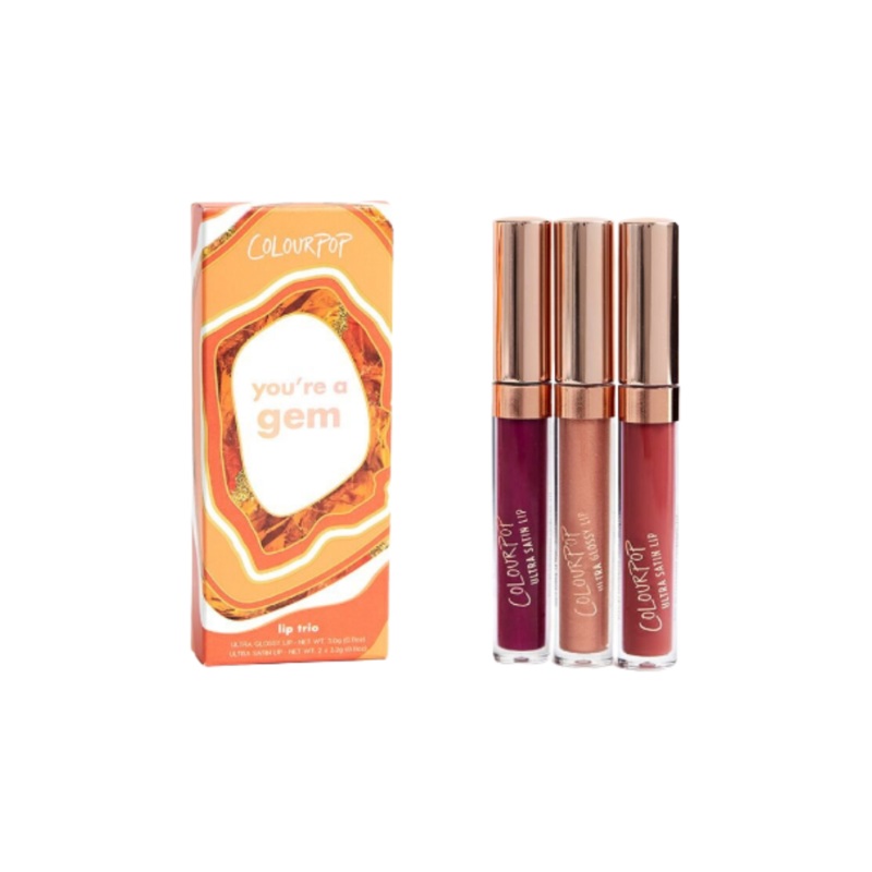 This mixed finish lip trio has your go-to shades for every look this season. Our moisturizing Ultra Satin formula is super comfy on dry, winter-chapped lips, and the gloss can be worn alone or on top of any lip to add a sparkly shine. All shades are exclus