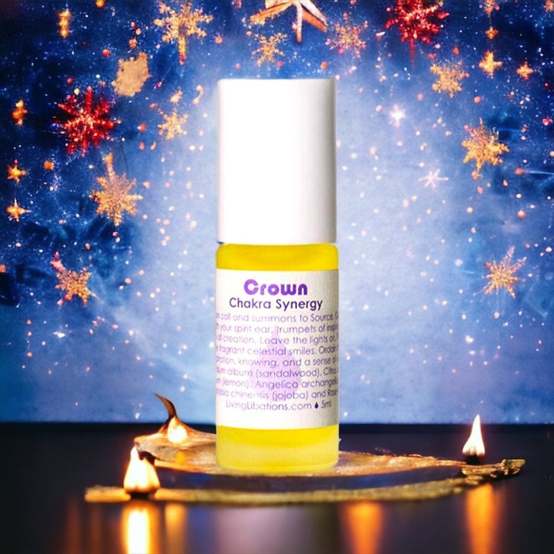 Crown Chakra Crown: a clarion call and summons to Source. Going out of your head, to hear with your spirit ear, trumpets of inspiration and songs of your relation to all creation. Leave the lights on. The crown spirals open to embrace fragrant celestial smiles. Ordain this angelic anoint to encourage inspiration, knowing, and a sense of divine-self. Chant sound for chakra: Om