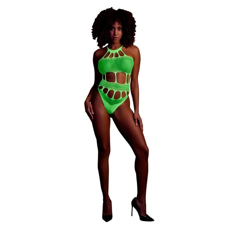 Designed to fit your body perfectly, this eye-catching bodysuit can be worn to a party or as lingerie and the UV activated material will make sure you stand out!Product features: Grecian style neckline Cut out design Glow in the dark stretch material Made