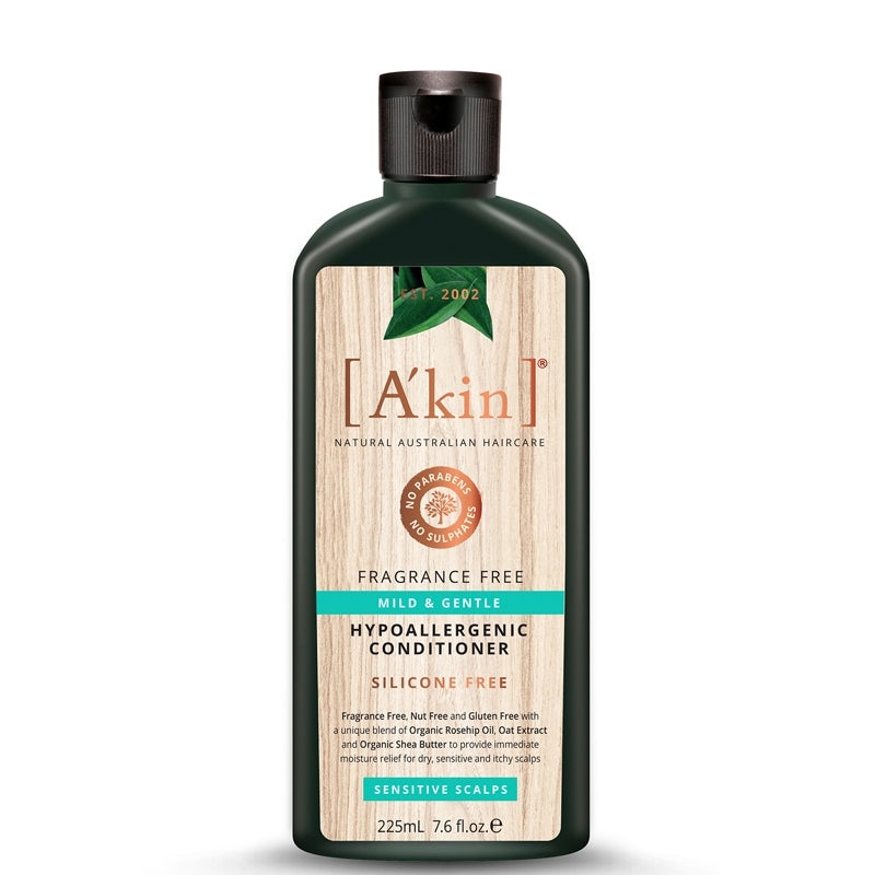 A'kin Fragrance Free Mild and Gentle Conditioner is fragrance free, nut free and enriched with a delicate infusion of Certified Organic Rosehip Oil, Organic Shea Butter, Jojoba Oil and Oat extract to soothe, nourish and comfort sensitive scalps. It helps t