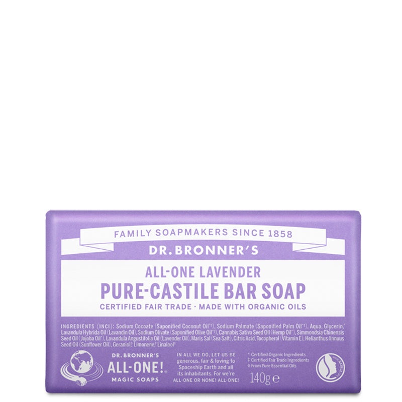 Dr Bronner's Lavender Pure Castile Soap Bar is a combination of Organic Extra Virgin Coconut, Olive, Jojoba and Hemp Oils, together with the relaxing fragrance of Lavender essential oil, creating a unique natural soap that cleans effectively without being