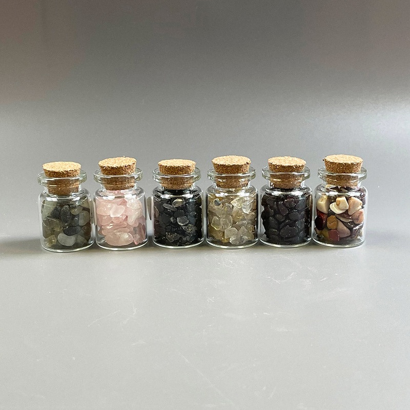 Each Jar is approx 5ml and 1" tall - Set One has one jar of each of the following crystal chips:LabradoriteRose QuartzObsidianRutile QuartzGarnetMookiteFilled with crystal tumbles and chips. Perfect for carrying or home decoration in plants. Perfect for cr