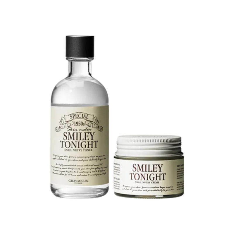 GRAYMELIN Smiley Tonight Snail Nutrition & Moisture 2-Piece Skincare SetDescriptionA power-packed duo featuring nourishing snail mucin, hydrating hyaluronic acid, soothing centella & cypress water, plus peptides for balanced moisture, barrier restoration,