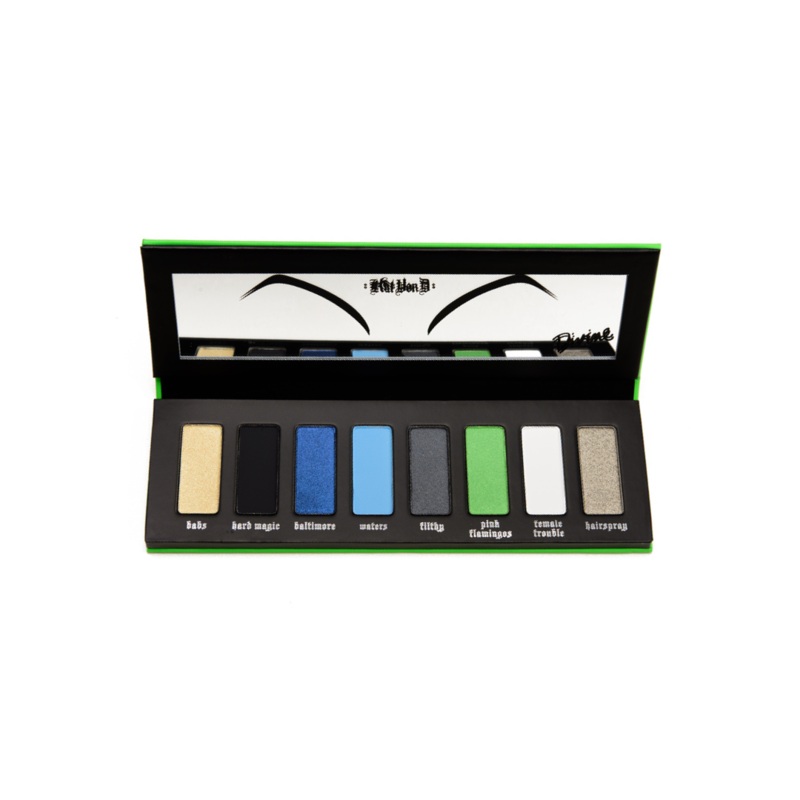 The Kat Von D x Divine Eyeshadow Palette was designed to power your self-expression with eyeshadows that range from girlish to glitzy, all inspired by Divines iconic look. Each shade was named in honor of Divines most famous performances, on and off the silver screen. These cushiony shades are blendable and buildable, in Kat Von Ds signature high-performance eyeshadow formula, for next-level eye looks that deliver major impact. From a metallic neon green to a shimmering navy, this eight-pan palette has every shade you need to color, create, and celebrate your boldest self. This super-limited-edition collection is inspired by one of Kats biggest muses: The one and only, late, great drag queen Divine. The Kat Von D x Divine Collection is a symbol of individuality and positivity, celebrating self-expression, transformation and the beauty of a true original.