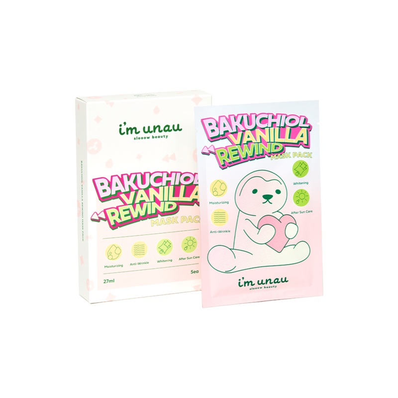 i'm unau Bakuchiol Vanilla Rewind Mask Pack 27ml x 5eaDescriptionThe Imau Natural Hydrogel Mask provides intense hydration and nourishment to the skin with its premium hydrogel formula. Enriched with natural ingredients, it minimizes skin irritation and of