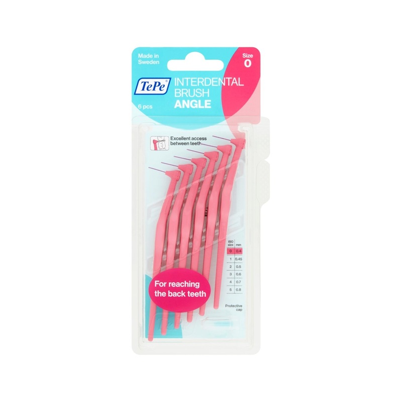 With protective cap Developed in collaboration with dental experts Plastic coated wire for gentle cleaning Angled interdental brush for excellent access between teeth Easy access from both outside and inside Efficient cleaning of implantsAngled interdental
