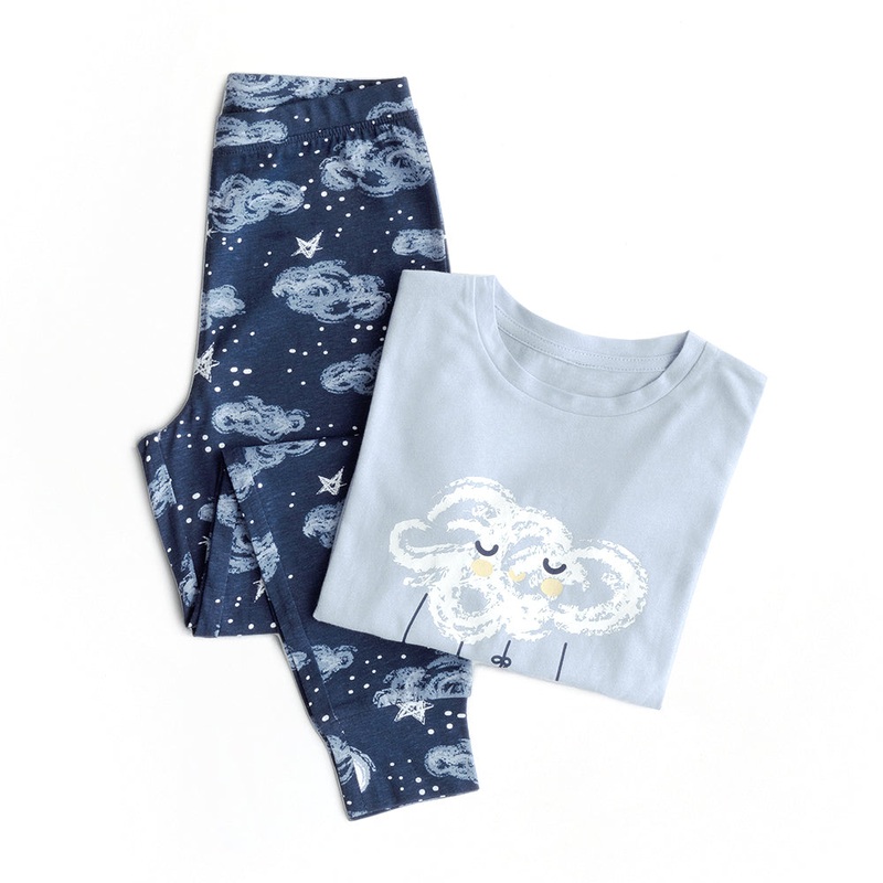 These 100% cotton pyjamas in hues of blue feature a short-sleeve top with cute cloud design and cuff-leg jogger pants with a night sky print.