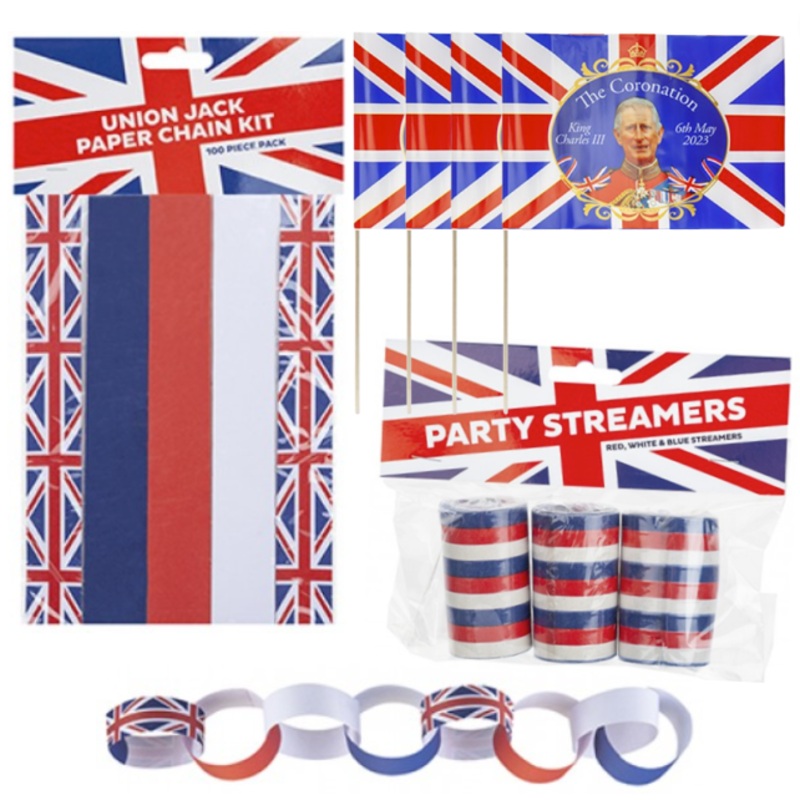 Kings Coronation DECORATIONS- Celebrate in Style with this Kings Coronation bundle.Great indoor/outdoor bunting for street parties, sports events or any type of celebration.Includes:Union Jack coronation 30cm x 20cm waving flag with stick - 4 PackCelebrate