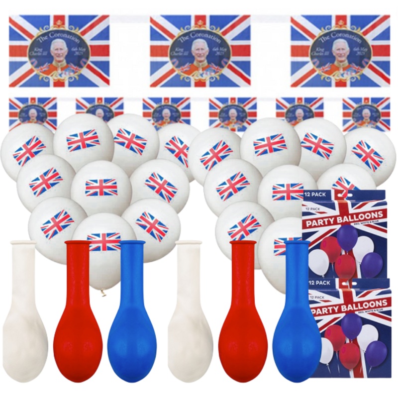 12 PACK UNION JACK BALLOONS RED/WHITE/BLUE X 212 assorted colour 11" latex balloosMix of red, blue & whiteSuitable for helium or air inflationWARNING:Not suitable for children under 8 years. Children can choke or suffocate on uninflated or broken balloons.