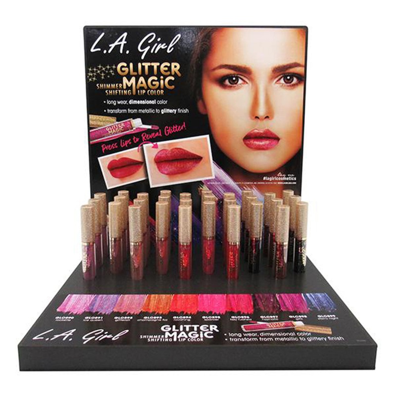 LA Girl Glitter Magic lip Color - Wholesale Display 30 UnitsCheap makeup! LA Girl Glitter Magic Lip color Sparkler is a lip gloss with two types of finishes.The special formula ensures that the lip gloss changes from a metallic finish to a glitter finish.I