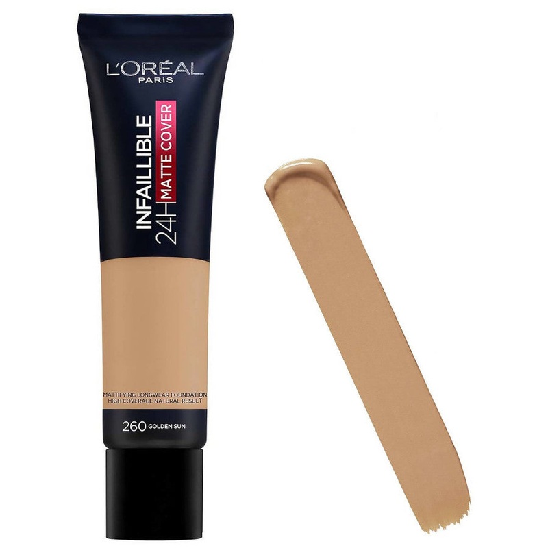 L'Oreal Infaillible 24HR Matte Cover Foundation 260 Golden SunFor a full coverage, no compromise base for the ultimate resistance, meet NEW LOreal Paris Infallible 24 hour Freshwear Foundation. With a new standard in longwear coverage its transfer-proof, l