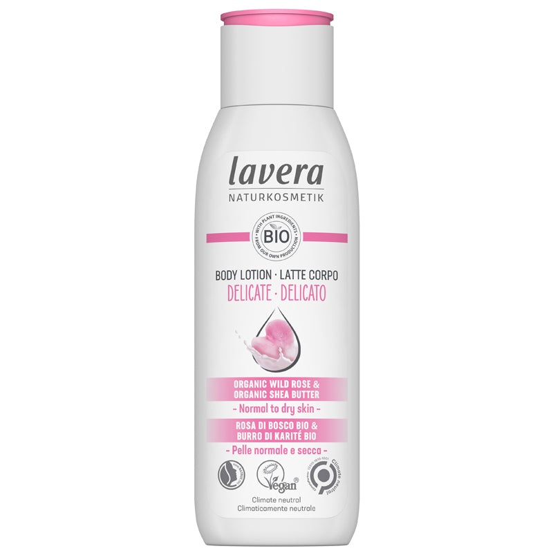Lavera Delicate Body Lotion with Organic Wild Rose provides intensive care for dry skin and spoils your senses with a floral aroma.Organic Wild Rose is known for its high content of Vitamin C, giving it a strengthening effect which leaves the skin feeling pleasant. Organic Shea Butter contains lots of valuable ingredients such as vitamin E; due to its intensely nourishing properties, it is used in Lavera’s products for dry skin.