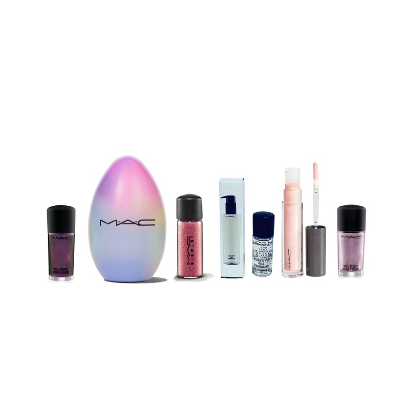 6pcMAC Beauty Egg Bespoke GiftsetFull Size ProductsIncludes:1x Lipgloss - Colours Vary1x Nail Colour - Colours Vary1x Eyeshadow -MAC Pigment Colour Powder Eyeshadow, Highlighter1x Eyeshadow -MAC Glitter Colour Powder Eyeshadow, Highlighter1x Eyeshadow - MA