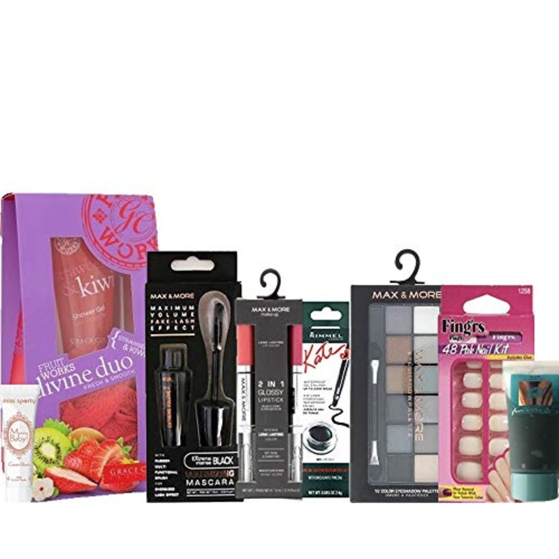 Details: Your 10 pc Set includes all of the following items 1x 12 colour nude & brown eyeshadow palette with applicator 1x 2pc lip colours with clear gloss top coat 1x Maximum volume black mascara 1x Rimmel Katie B Green Eyeliner 1x M&S body toning gel 30ml 1x Cream Blusher Tube 1x Pack of false nails 2pc Grace Cole Fruit Works Fruit Divine Duo set, comprises of 50ml Shower Gel & Body Ball . …. Colours will vary ….Free Gift Wrapping Available Upon Request