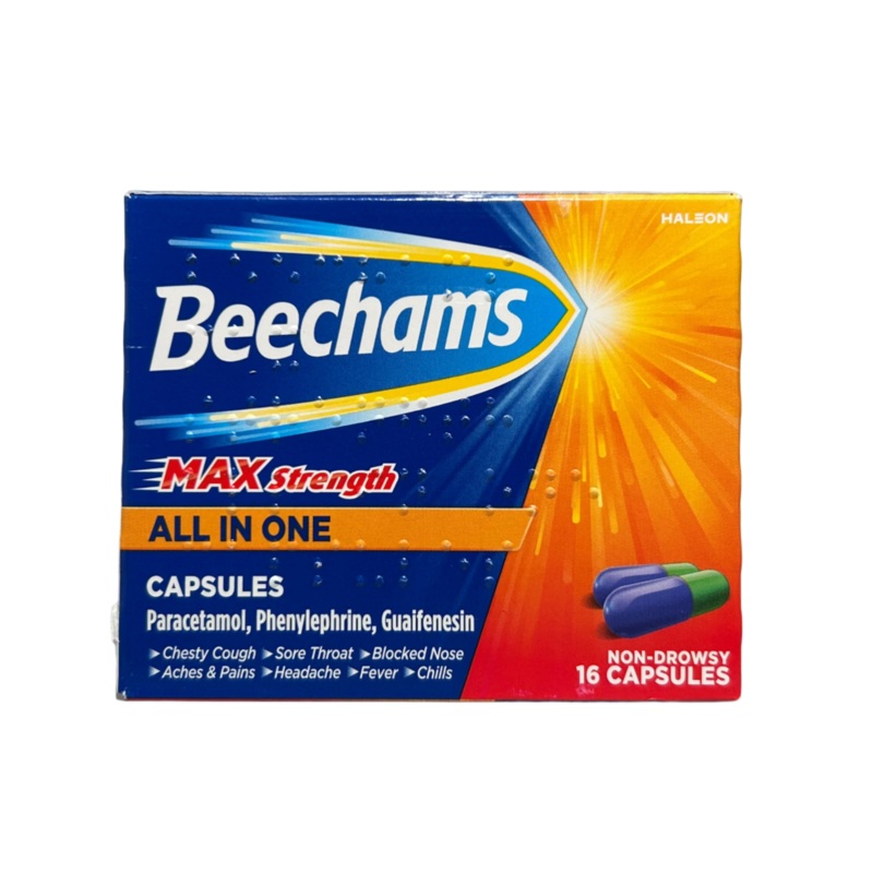 Beechams Max Strength All in One capsules provide relief from the symptoms of colds and flu including aches and pains, headache, blocked nose and the pain and congestion of sinusitis, sore throat, chills, lowering of temperature, and to loosen stubborn mucous and provide relief from chesty coughs.
