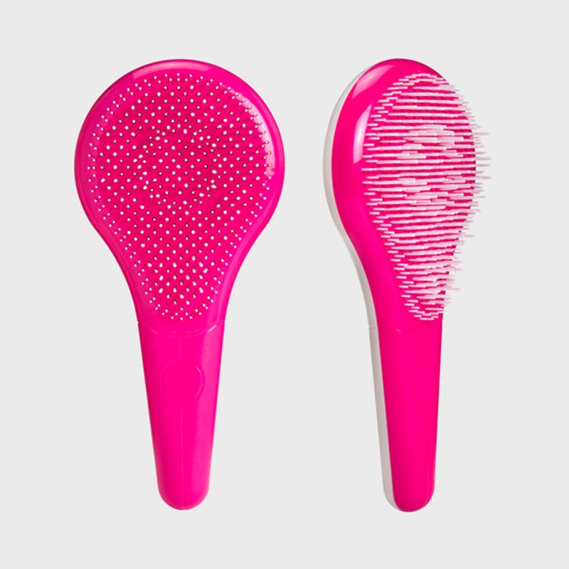 This revolutionary detangling brush features innovative flex technology that gently glides through knots without pulling or breaking delicate strands. The ergonomic handle provides optimal control while the unique Memphis-style bristle pattern works on all hair types, from fine to coarse textures. Perfect for both wet and dry styling, this professional-grade tool delivers salon-worthy results while minimizing damage and maximizing shine.