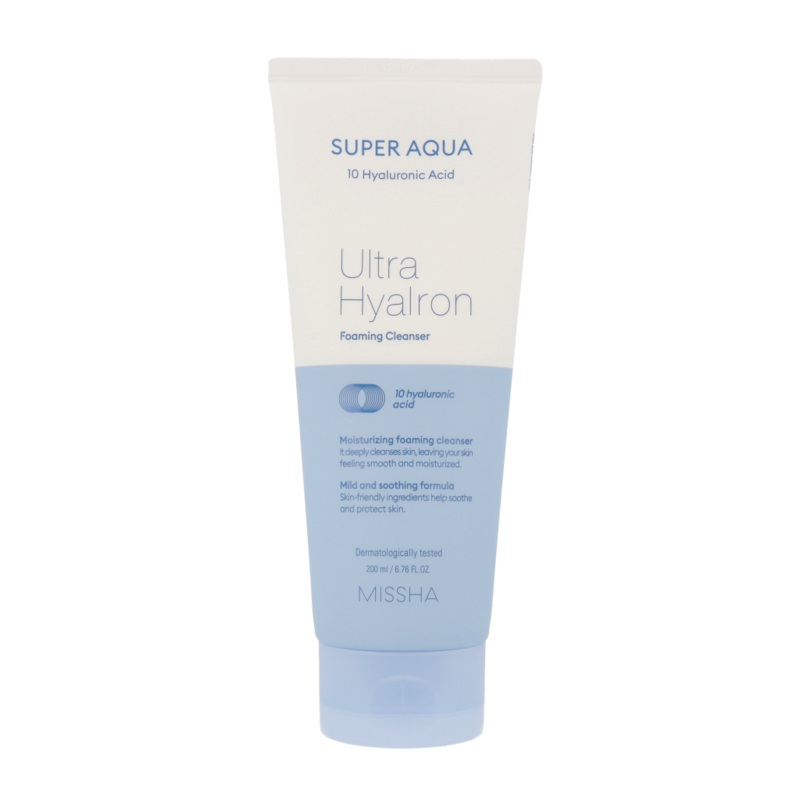 MISSHA Super Aqua Ultra Hyalron Foaming 200mlDescriptionA deep-cleansing foam cleanser with 10 types of Hyaluronic Acid Complex to create long-lasting hydration. Different molecular sizes of Hyaluronic Acid build up a barrier to prevent dry skin, while pro