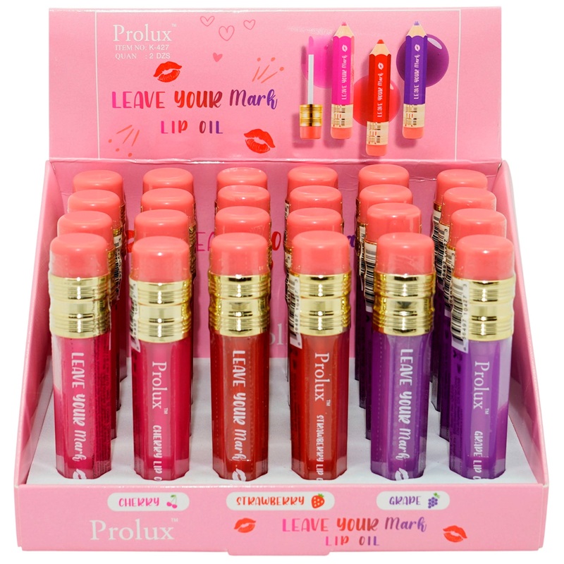 Prolux Leave Your Mark Lip Oil - Wholesale Display 24 UnitsMake your lips shine with the Prolux Leave Your Mark Lip Oil! This ultra-hydrating formula nourishes and softens your lips while delivering a sheer, glossy finish. Infused with fruity flavors, each
