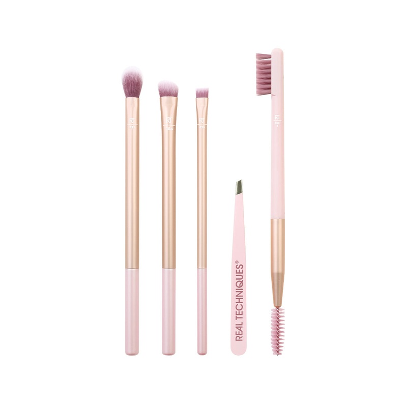 Real Techniques 4263 Natural Beauty Eye Kit is a set composed of: five eye and eyebrow tools: Eye Shadow Brush, Illuminating Eyebrow Brush, Eyeliner Brush, Eyebrow Comb, Spoolie and a pair of tweezers. Vegan.