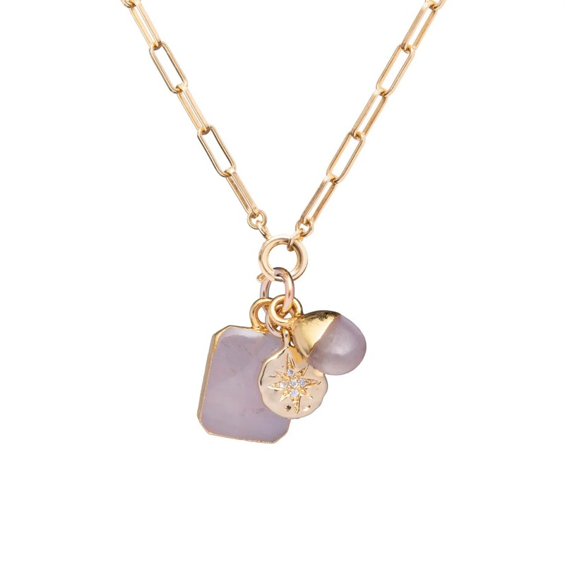 Rose Quartz Gem Slice Triple Chunky Chain Necklace Star Coin – Love (Gold Plated)