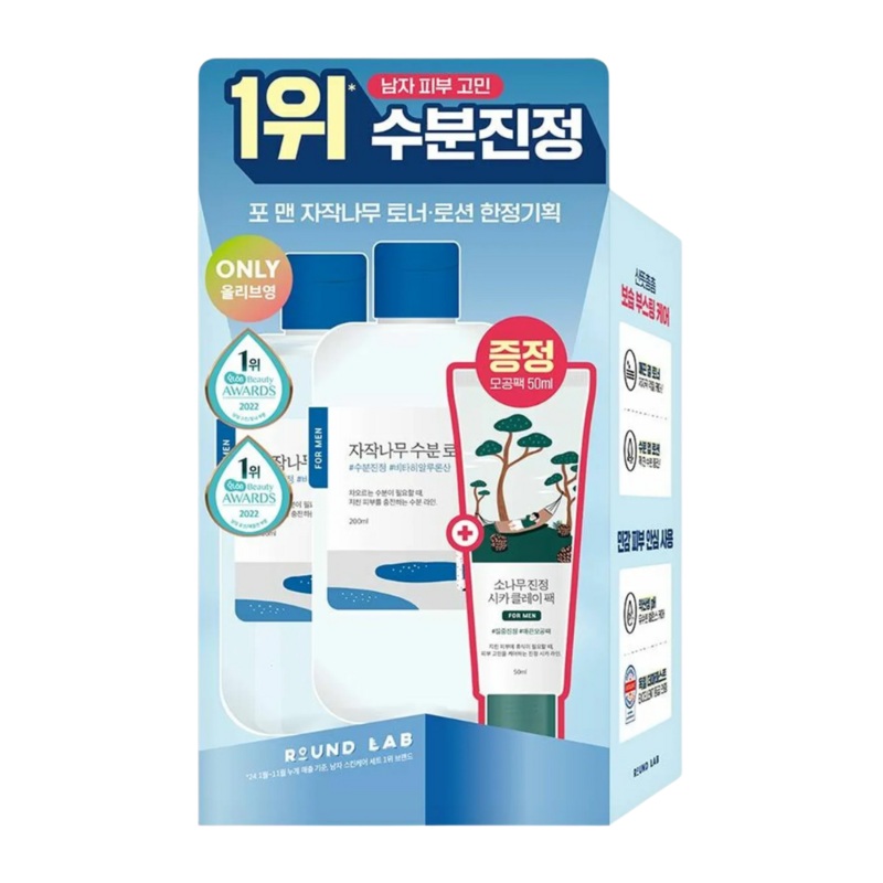 ROUND LAB For Men Birch Juice Toner/Lotion Limited Set (+Clay Pack 50ml)DescriptionPerfect companion for sensitized and bumpy aftershave burns. Intensive dose of Vita Hyaluronic and Birch Juice Extract for instant soothe and calm.RejuvenatingHydration Lock