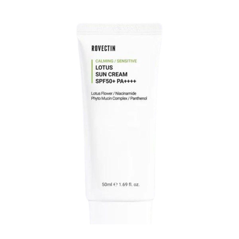 ROVECTIN Calming Lotus Sun Cream SPF 50+ PA ++++ 50mlDescriptionRovectin Lotus Sun Screen is packed with Lotus Flower Extract, well known for its self purifying and detoxifying abilities, helps protect skin from harmful toxins and fine dust. With the added