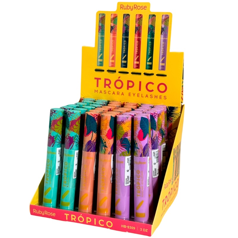 Ruby Rose Tropico Eyelash Mascara - Wholesale Display 36 UnitsRuby Rose Mascara DisplayThis display includes an assortment of three different mascaras, each designed for a unique effect. Turquoise Mascara - Extra Volume Mascara: Specially created to define