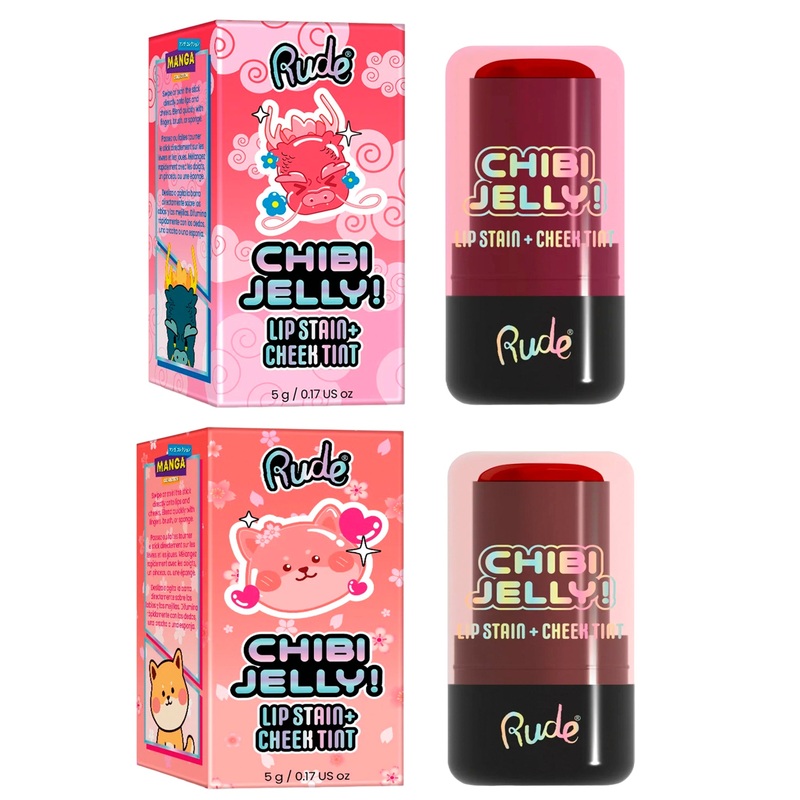 • Rude Cosmetics Chibi Jelly Lip Stain + Cheek Tint with a moisturizing jelly texture.