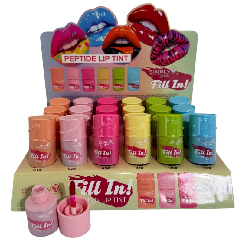 Simply Bella Fill In! Peptide Lip Tint - Wholesale Display 24 UnitsAssorted in 6 shadesSay hello to bold color and soft, nourished lips! The Simply Bella Fill In! Peptide Lip Tint combines vibrant, long-lasting pigment with the power of peptides to help sm