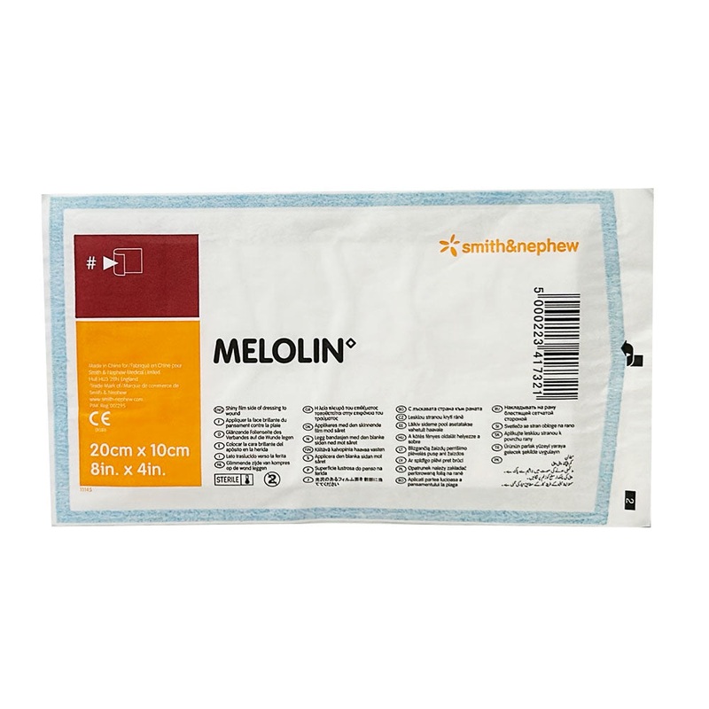 A low-adherent absorbent dressing used for the management of a wide variety of light to moderately exuding wounds, including clean sutured wounds, abrasions, lacerations and minor burns. Melolin consists of a highly absorbent cotton and acrylic fibre pad which is heat bonded on one side to a very thin perforated polyester film. The film side of the dressing is placed next to the wound. There is a hydrophobic backing layer.