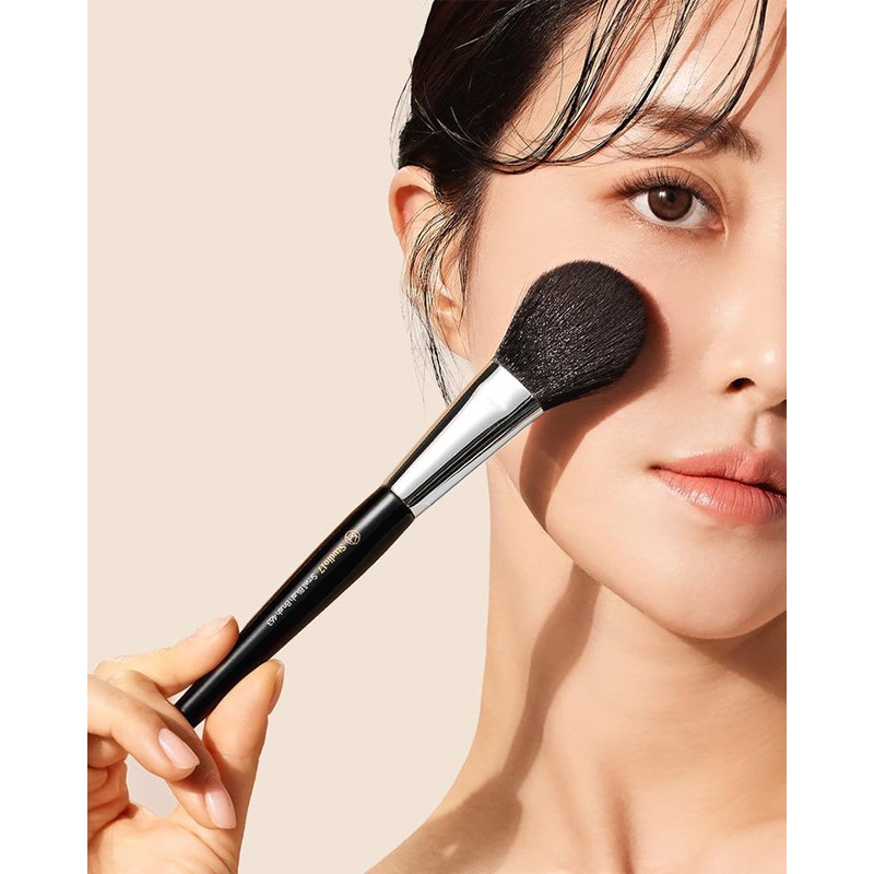 Lightly dip the brush into blush and gently sweep the cheekbones with soft, upward strokes.