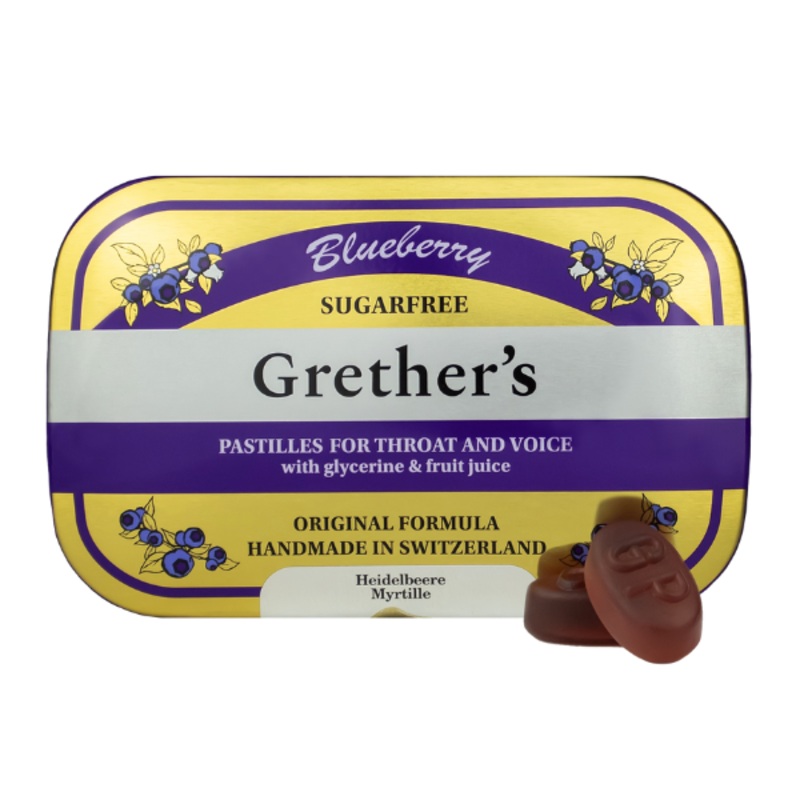 Blueberry is the latest refreshing flavor that Grether`s has to offer! The naturally pure juices of fresh blueberries lend these traditional pastilles their stunning color and unforgettable fruity aroma. Classic sugar free pastilles in the golden tin were invented around 300 years ago and today they are still being manufactured by hand in Switzerland according to an old English formula. Recommended for hoarseness, sore throats, raspy voice and dry mouth.