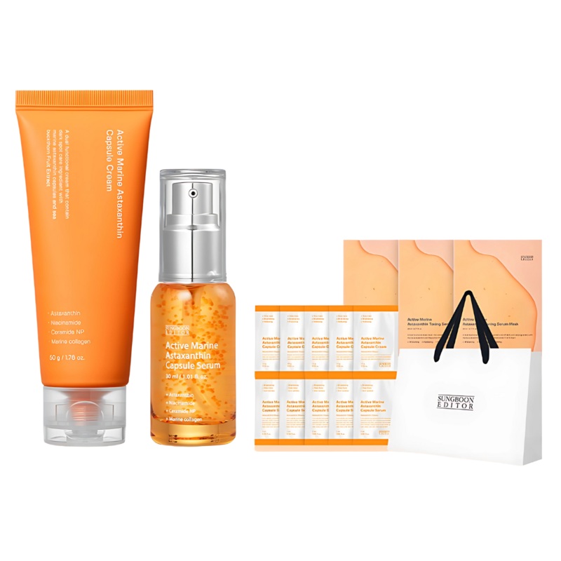 SUNGBOON EDITOR [GIFT SET] Marine Astaxanthin Cream (50g) + Serum (30ml)DescriptionCream:The Active Marine Astaxanthin Capsule Cream is a multi-functional facial cream designed for brightening, deep hydration, and soothing care. Infused with astaxanthin, n
