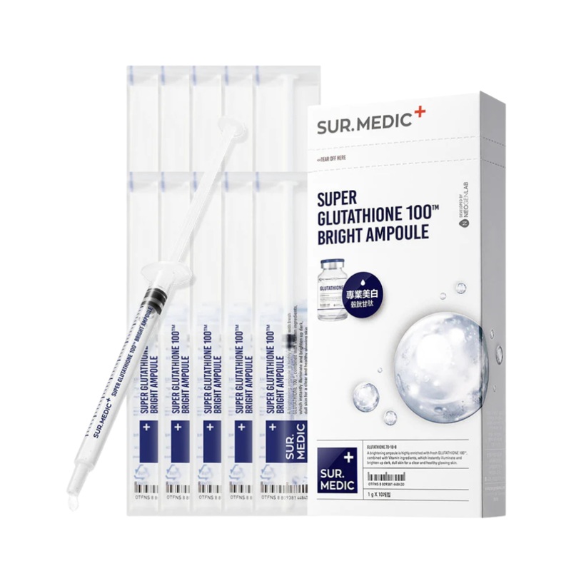 SUR.MEDIC+ Super Glutathione Brightening Ampoule 1ml Set of 10DescriptionA brightening ampoule is highly enriched with fresh Glutathione 100TM, combined with Vitamin ingredients, which instantly illuminate and brighten up dark, dull skin for a clear and he