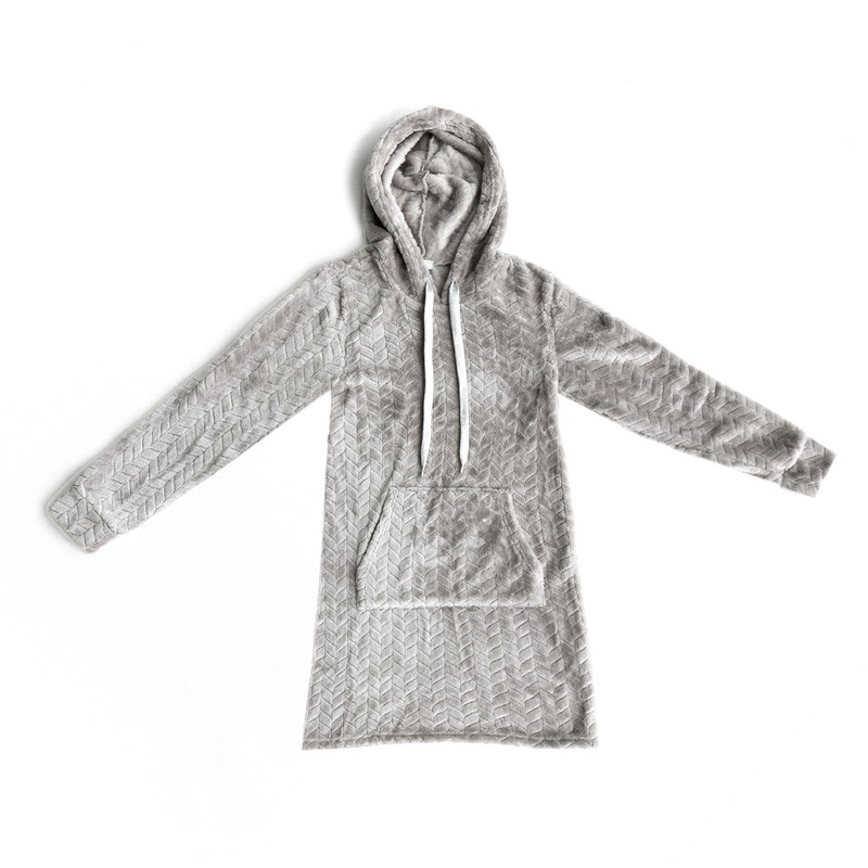 Made with super plush polyester material – our Textured Lounge Dress in either light grey or deep blue features a drawstring hoodie to keep your ears warm and a kangaroo front pocket to keep your fingers toasty.