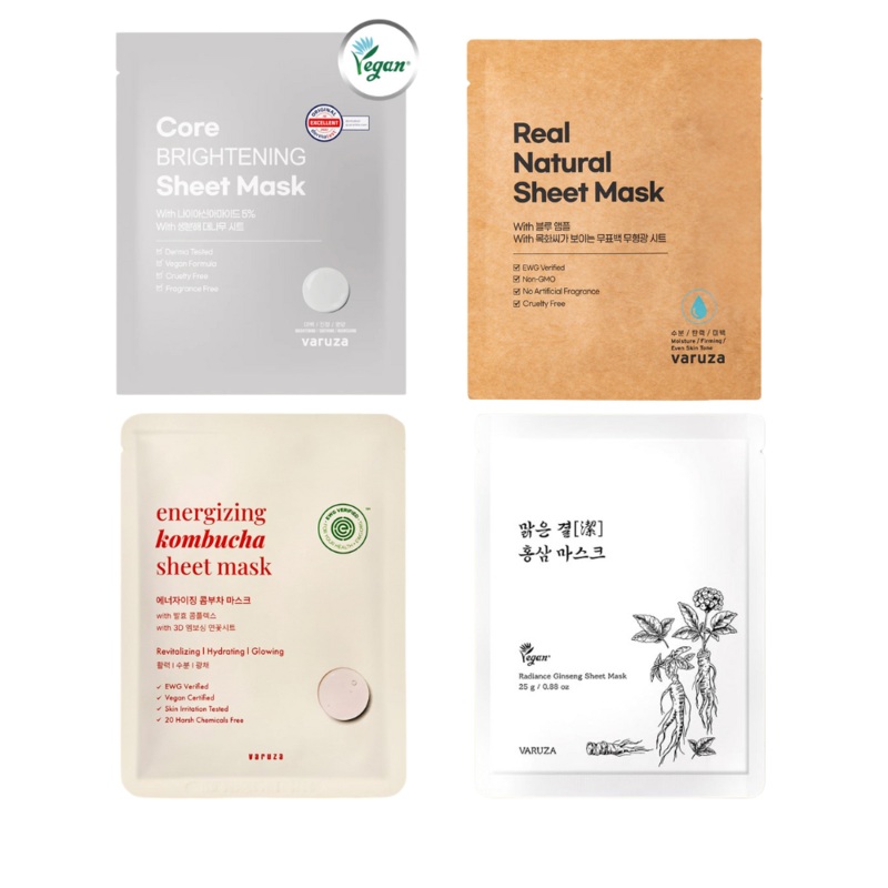 varuza Core Brightening Sheet Mask: Water, Propanediol, Niacinamide, Methylpropanediol, Glycerin, Allantoin, Adenosine, Nelumbo Nucifera (Lotus) Root Extract, Oryza Sativa (Rice) Extract, Citrus Limon (Lemon) Fruit Extract, Hippophae Rhamnoides (SeaBuckthorn) Fruit Extract, Tranexamic Acid, Arbutin, Cetearyl Olivate, Sorbitan Olivate, CocoCaprylate/Caprate, Caprylic/Capric Triglyceride, Cetyl Ethylhexanoate, Sorbitan Stearate, Tromethamine, Acrylates/C1030 Alkyl Acrylate Crosspolymer, 1,2Hexanediol, Hydroxyacetophenone, Disodium EDTA
