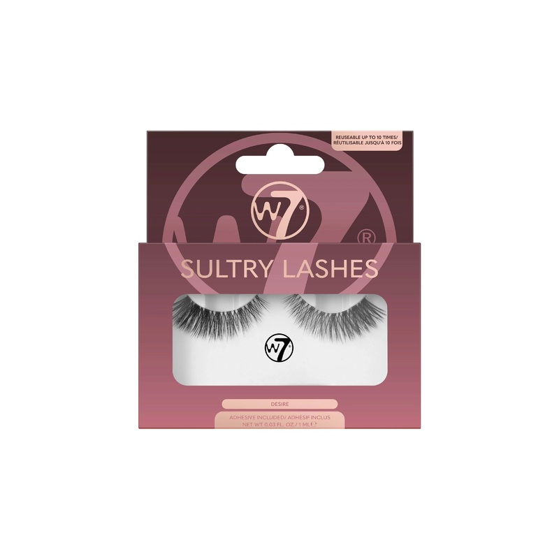 Enhance your eye look effortlessly with W7 Sultry Lashes! With 2 styles to choose from, these lashes provide a natural and sultry look. Plus, the included adhesive allows for easy application and they can be reused up to 10 times. Perfect for any occasion!