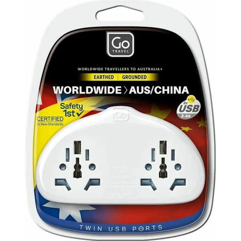 This World to Australia and China travel adapter makes an essential companion for powering multiple devices from a single socket for travellers from 100s of destinations.The 2 USB ports have a 2.4A shared auto-regulating power output when dual charging. Pe